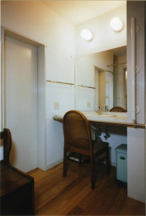 一番左に扉が見える部屋がお母様の寝室。 廊下をまっすぐ行って右側に脱衣・浴室。 正面のキッチン右奥のユーティリティからも脱衣室に入れます。