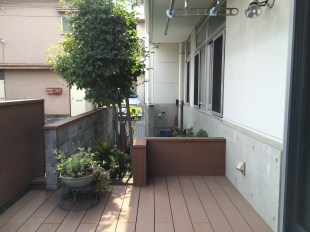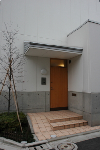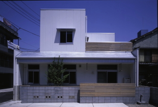 外観です。 バリアフリー住宅でもデザイン性を忘れてはいけないという気持ちでまとめました。 1階左側がリビング・ダイニング・キッチン。右側が和室、その前にウッドデッキ。 2階に寝室とピアノ室という構成です。 手前は貸し駐車場。和室を寝室にすれば1階だけで暮らせるように考えてあります。