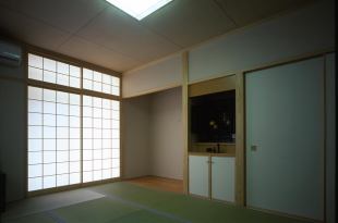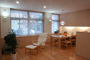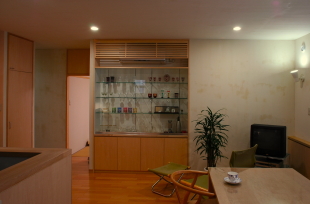 掃き出しのサッシを避けて、下部に収納を設け腰窓にしてあります。その上に天井までのサッシ。その事により居住空間としての落ち着きが出ています。サッシは重くなる事を避け、小割にしました。