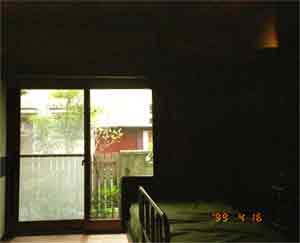 南側の窓は以前、型ガラスだったが透明のガラスに替えた。庭の向こうは通路だがカーテンなどで視線をコントロールできる。