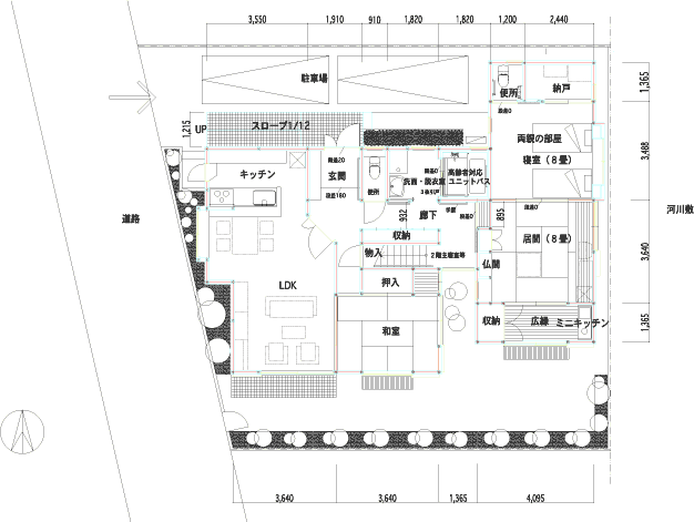 これらの課題に対して建築が関われることを整理し、「互いの生活を阻害せず、両親をそっと見守れること」・「安全で誰もが使いやすく、介護もしやすいこと」の二つを基本的考え方として設計の中心に据えました。この基本的考え方をふまえ「明るく暖かく過ごしやすい住まい」・「パブリックな生活とプライベートな生活を両立させる住まい」「2世帯を適度に分離しつつ“共住”のできる住まい」を目指した計画をしました。