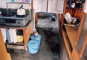 住まいの環境;お店を営んでいた時期があり、土間を挟んでトイレ空間がありました。トイレの前には風呂釜が設置されており、キッチンはトイレの背面の土間に(W=1200)シンクとガステーブルが配置されています。トイレと居室の間に土間を挟んだ空間の段差はH=430mmです。